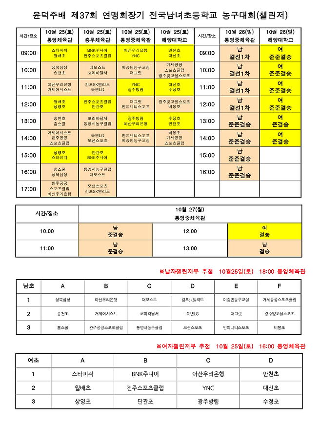 윤덕주배 제37회 연맹회장기 전국남녀초등학교 농구대회가 25일 경남 통영에서 막을 올린다.