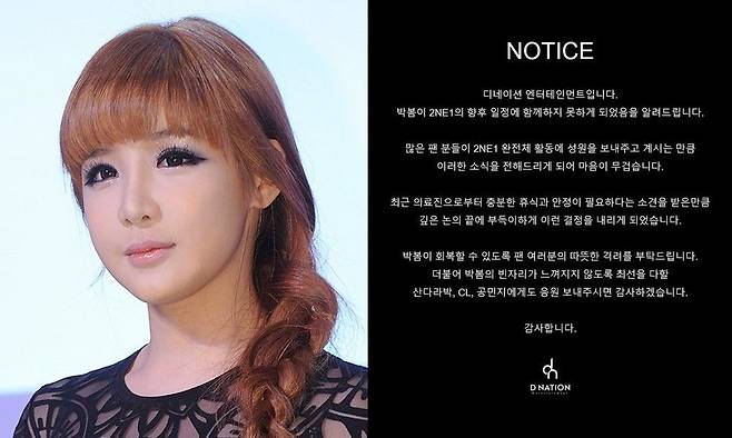 결국 박봄은 여러 비판에 직면해 해당 글을 삭제했다. 그의 종잡을 수 없는 행보에 박봄의 소속사 디네이션엔터테인먼트 측은 "우리도 컨트롤이 되지 않는다"는 무거운 심경을 전했고, "2NE1 활동 관련 정산은 이미 완료됐으며, 해당 고소장은 실제 접수된 사실이 없다"라고 공식 입장을 밝혔다. 소속사는 이어 "박봄은 모든 활동을 중단하고 치료 및 회복에 전념하고 있다. 당사는 아티스트가 건강을 되찾을 수 있도록 최선을 다하겠다"고 덧붙였다.