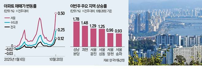 23일 한국부동산원에 따르면 이번주(20일 기준) 서울 아파트 매매가는 0.50% 뛰었다. 2018년 9월 첫째 주에 기록한 0.47%를 넘어 역대 가장 큰 상승 폭이다. 조사 기간은 20일까지 1주일간이다. 그사이에 ‘10·15 대책’ 발표가 끼어 있어 매수 광풍이 분 영향을 받았다. 서울 아파트는 15일 하루에만 717건(국토교통부 실거래가 기준)의 매매가 이뤄졌다. 14일에도 488건에 달했다. 박원갑 국민은행 부동산수석전문위원은 “규제 강화로 대출 한도가 대폭 줄고, 갭투자(전세 끼고 매매)가 막혔다”며 “한동안 집을 사고팔기 어려워져 그 전에 수요자가 급하게 움직인 것”이라고 설명했다.