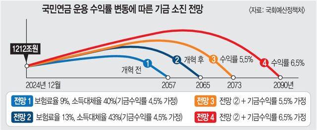 23일 국회 예산정책처가 국회 보건복지위원회 소속 김남희 더불어민주당 의원에게 제출한 '국민연금 기금 운용수익률 가정에 따른 재정 추계'에 따르면 국민연금 운용수익률을 연 6.5%로 가정하면 2090년에, 5.5% 수익률에선 2073년에 각각 기금이 고갈되는 것으로 나타났다.