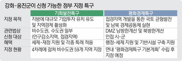 접경지역 개발로 남북 경제공동체를 실현한다는 목적의 ‘평화경제특구’는 정부가 올해 안에 기본계획을 수립해 내년에는 특구 지정을 위한 공모를 실시한다고 했지만, 구체적인 일정이 나오지 않았다. 오랜 기간 각종 규제에 묶여 산업 유치나 개발에 밀려나 있던 강화·옹진군이 돌파구로 생각한 기회발전특구와 평화경제특구 모두 기약이 없는 셈이다.