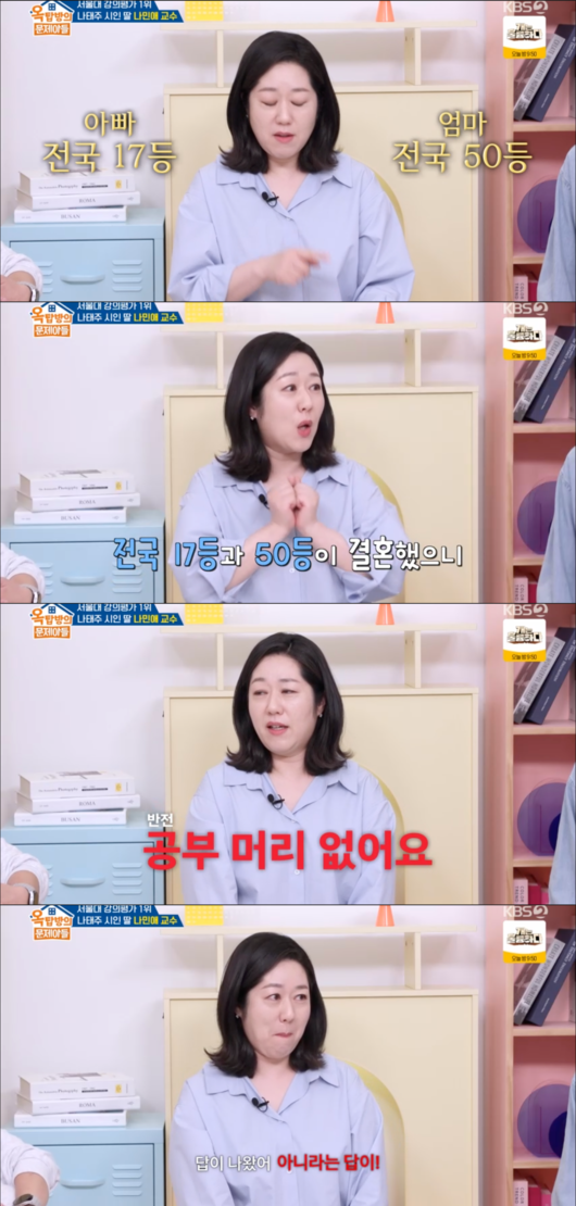 한편, 나 교수는 자녀의 '공부머리'에 대해서는 현실적인 고민을 드러내며 시청자들의 공감을 샀다. 그는 "저희 애들을 보면 안다. 남편은 전국 17등, 나는 전국 50등이었다"라며 부부가 학창 시절 수재였음을 밝혔다.