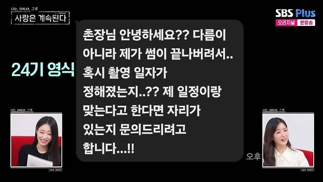 24기 영식은 "처음엔 (출연) 거절했다. 썸녀가 썸인가 싶어서 거절했는데, 썸이 아니더라"라고 고백해 현장과 스튜디오를 웃음바다로 만들었다. 영식은 "'촌장님 혹시 자리 있냐'고 하니까 자리 마련했다고 하더라. 그래서 온 거다"라고 덧붙였다.