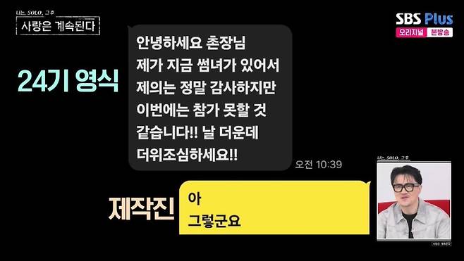 23일 방송된 SBS Plus '나는 SOLO, 그 후 사랑은 계속된다'(이하 '나솔사계')에서는 27기 영식과 영호, 24기 영식과 영수가 출연했다.