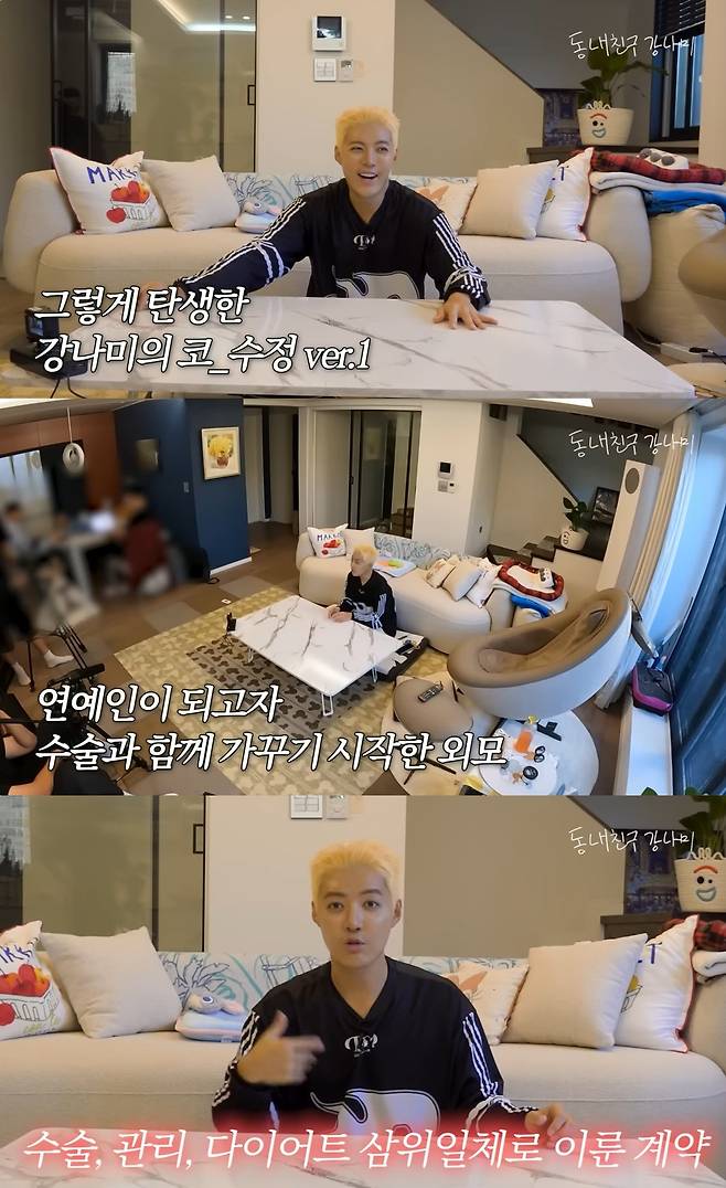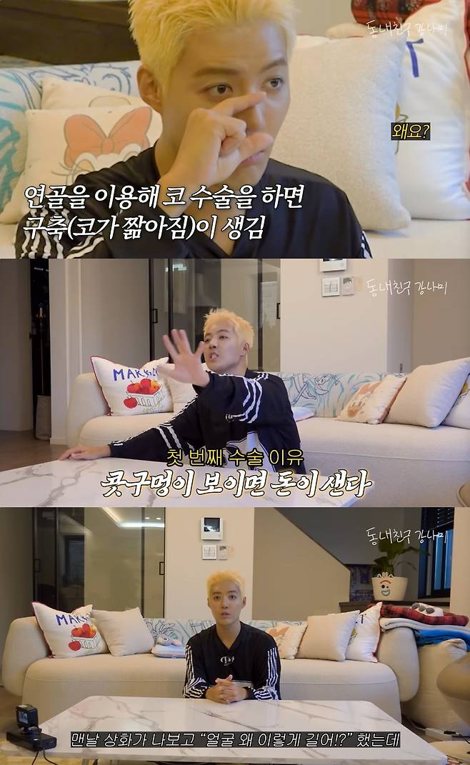 강남은 "연골로 코 수술을 하면 코가 짧아진다. 점점 줄어서 콧구멍만 보이더라. 신경은 안 썼다. 잘생겨서 이득되는 것도 없다. 근데 콧구멍 보이면 돈이 샌다더라. 그래서 아무리 벌어도 샌다"며 자신의 구축을 고백했다.