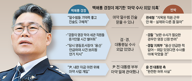 백 경정은 올해 들어 유튜브·언론 인터뷰 등에서 “윤 대통령 부부가 내란 수행에 필요한 운영 자금을 마련하기 위해 마약 독점 사업을 벌였다”고 주장하고 있다. 그러면서도 직접적인 근거는 제시하지 않고 있다. 그는 지난달 언론 인터뷰에서 이런 의혹의 근거를 제시해 달라는 질문에 “모든 것은 내 추정이며, 나를 수사하게 내버려 뒀으면 이런 얘기를 할 필요도 없다”고 했다. 윤 전 대통령 측은 “완전한 허위 의혹 제기”라고 했다.