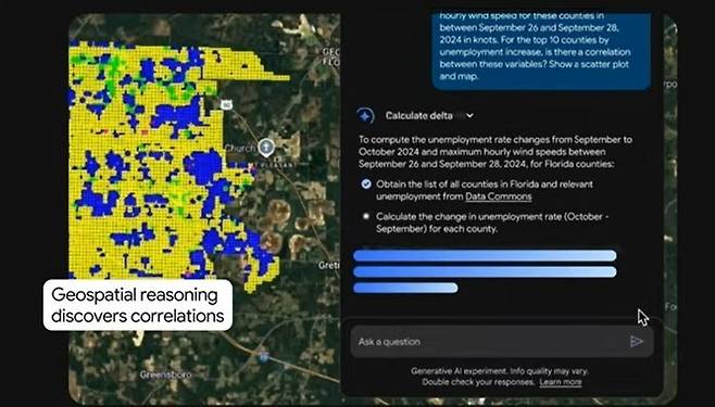 '구글 어스 AI'는 제미나이를 기반으로 날씨 예보와 인구 밀도 지도, 위성 이미지 등 지금까지 분리돼 있던 여러 '어스 AI' 모델을 AI가 자동으로 연결해 이용자의 복잡한 질문에 답합니다.