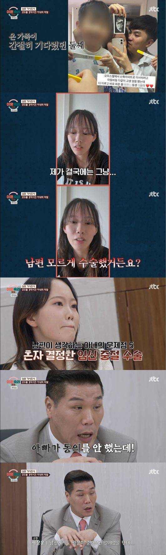 부부의 갈등은 둘째 임신과 관련해 극단으로 치달았다. 아내는 남편 모르게 중절 수술을 했다는 충격적인 사실을 고백했다. 아내는 "그게 11주차 때"였다고 덧붙였고, 남편은 온 가족이 중절 수술을 말렸음에도 아내가 수술을 했다고 밝혔다.