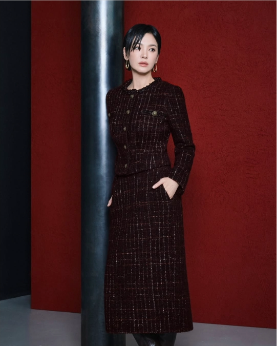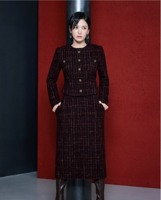 23일 송혜교는 자신의 SNS를 통해 한 패션 브랜드의 겨울 화보를 공개했다. 사진 속 그는 짙은 버건디 컬러의 트위드 재킷과 스커트, 롱부츠를 매치하며 특유의 우아하면서도 단단한 존재감을 드러냈다.