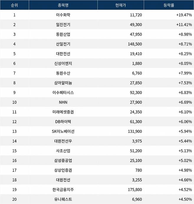 6위 신성이엔지(011930)는 현재가 1,880원으로 8.05% 상승 중이다. 7위 동원수산(030720)은 현재가 6,760원으로 7.99% 상승 중이다. 8위 삼아알미늄(006110)은 현재가 27,850원으로 7.53% 상승 중이다. 9위 이수페타시스(007660)는 현재가 92,300원으로 6.83% 상승 중이다. 10위 NHN(181710)은 현재가 27,900원으로 6.69% 상승 중이다.