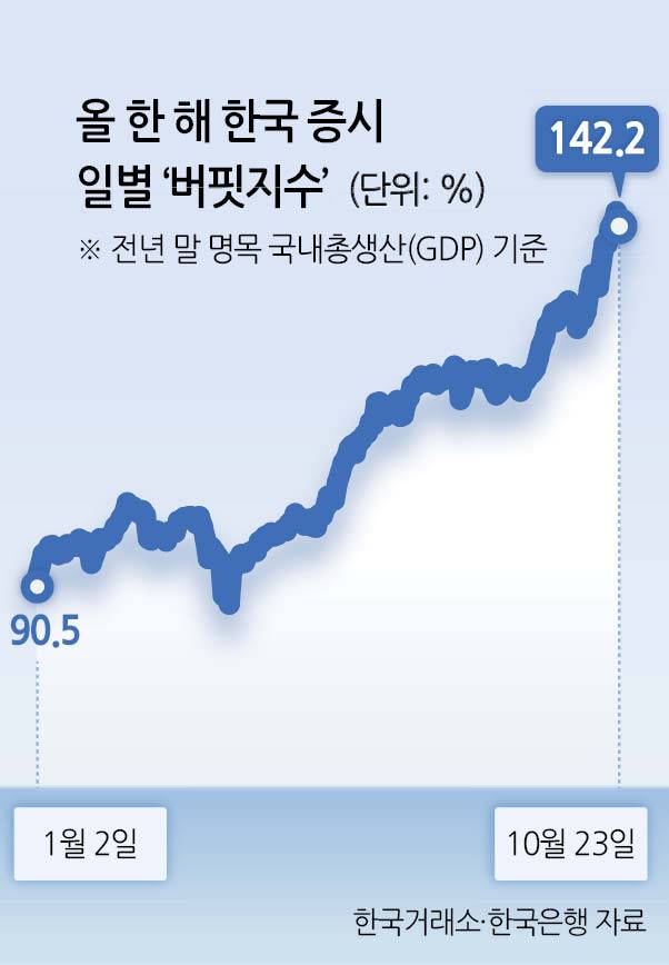 종전 최고 기록은 ‘동학개미운동’이 벌어지며 국내 증시 강세장이 펼쳐졌던 2021년 8월 21일 135.0%였다. 이는 코스피 시가총액 규모가 3011조9081억원으로 사상 처음 종가 기준 3000조원 선을 넘어섰던 지난 15일(136.0%) 넘어섰고, 지난 20일부턴 버핏지수가 140%대를 유지하고 있다.
