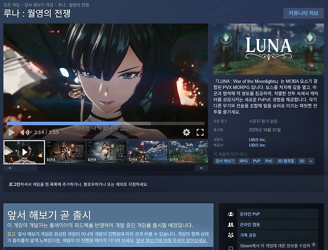 유비스 '루나' 스팀페이지 오픈...10월 31일 글로벌 얼리액세스 출시