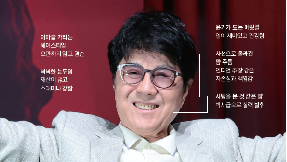머릿결에 윤기가 도는 것을 보면 그는 건강관리를 매우 잘하고 있는 듯하다. 슈퍼스타는 대개 이마를 드러내는 헤어스타일을 즐겨한다. 훤히 드러난 이마는 ‘나는 나’라며 스스로에게 권위를 부여하는 왕관이다. 그런데 조용필은 데뷔 시절부터 한결같이 이마를 가리는 스타일을 고수했다. 스타이면서도 오만하지 않고 정치색도 내지 않는 겸손한 사람이다.