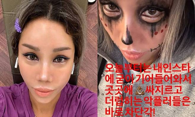 김송은 24일 자신의 계정에 "오늘부터는 내 계정에 굳이 기어들어와서 곳곳에 똥 싸지르고 더럽히는 악플러들은 바로 차단닥! 24시간 잠도 안자고 여기저기 알을 까대는 바퀴벌레"라는 글을 게재했다. 이와 함께 김송은 할로윈 분장을 한 사진을 함께 업로드하며 악플러들에게 경고를 남겼다.