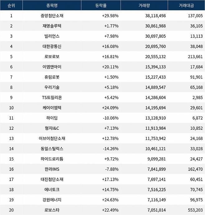 한편 거래량 상위 20위권 종목들은 하이딥(365590) ▼10.06%, 형지I&C(011080) ▲7.13%, 이브이첨단소재(131400) ▲12.78%, 동일스틸럭스(023790) ▼14.26%, 하이드로리튬(101670) ▲9.72%, 한라IMS(092460) ▼7.88%, 대진첨단소재(393970) ▲17.13%, 에너토크(019990) ▲14.75%, 강원에너지(114190) ▲24.63%, 로보스타(090360) ▲22.49% 등의 성적을 기록하고 있다.
