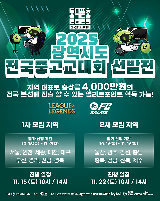 한편 ‘2025 전국중고교대회’는 문화체육관광부가 주최하고 한국e스포츠협회가 주관하며, 한국콘텐츠진흥원, 라이엇게임즈, 넥슨코리아, 삼성전자, 시디즈, 로지텍, 골 스튜디오, MSI, SK텔레콤이 후원한다.