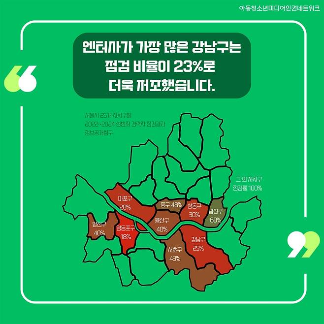 | ▲ 엔터사에 대해 허술한 관리감독 엔터사는 성범죄자 취업제한 업종이기에 이에 대해 지자체가 점검해야 한다. 서울시 전체의 점검률은 2022~2024년 평균 42%에 불과하였는데, 특히 가장 많은 업체가 소재해있는 강남구와 마포구의 점검률은 25%, 28%로 매우 저조하였다. |