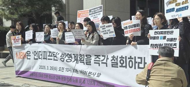 | ▲ 언더피프틴 방영 철회 촉구 기자회견 129개 여성시민사회단체가 MBN 앞에서 언더피프틴 방영 철회 촉구 기자회견을 진행하고 있다. |