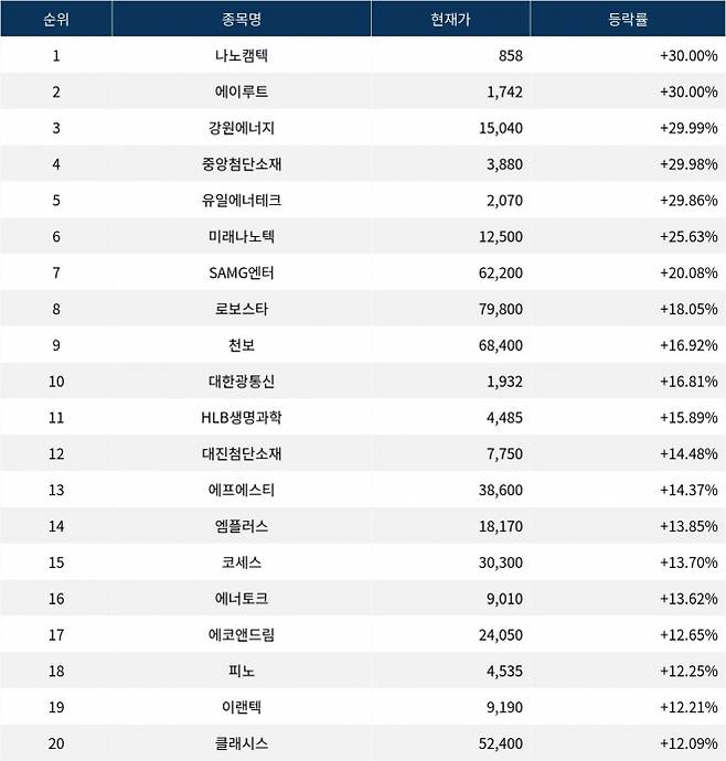 6위 미래나노텍(095500)은 종가 12,500원으로 25.63% 상승 마감했다. 7위 SAMG엔터(419530)는 종가 62,200원으로 20.08% 상승 마감했다. 8위 로보스타(090360)는 종가 79,800원으로 18.05% 상승 마감했다. 9위 천보(278280)는 종가 68,400원으로 16.92% 상승 마감했다. 10위 대한광통신(010170)은 종가 1,932원으로 16.81% 상승 마감했다.