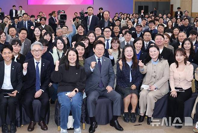 [대구=뉴시스] 고범준 기자 = 이재명 대통령이 24일 대구광역시 북구 엑스코에서 열린 '대구의 마음을 듣다' 타운홀 미팅 후 참석자들과 기념촬영 하고 있다. 2025.10.24. bjko@newsis.com
