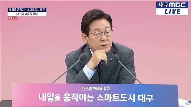 대구 안경 업체를 언급하며 자신이 쓰는 안경도 대구산이라며 "가급적 (안경은) 대구에서 생산한 것을 쓰시라"라고 말했습니다.