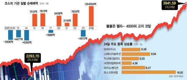 시장 랠리를 이끈 것은 기관 자금이었다. 기관은 1조 4050억 원을 순매수하며 2022년 1월 27일(1조 8478억 원) 이후 최대 규모 순매수를 기록했다. 외국인도 5756억 원을 순매수한 반면 개인은 2조 원 넘게 매도하며 차익 실현에 나섰다. 기관은 이달 초까지만 해도 매수·매도를 오가며 방향성을 저울질했지만 15일 이후부터는 뚜렷한 매수 기조로 전환해 이날까지 열흘 남짓한 기간에만 3조 9896억 원을 사들였다. 이진우 메리츠증권 리서치센터장은 “프로그램 매수를 중심으로 기관의 수급이 회복되는 흐름”이라며 “연기금도 실적 기반 업종을 위주로 전략적 비중 확대에 나선 것으로 보인다”고 분석했다. 올 6월 이후 외국인은 20조 423억 원을 순매수하며 상승장을 주도했고 기관도 2조 7942억 원을 사들이며 매수 우위로 돌아섰다. 반면 같은 기간 개인은 27조 714억 원을 순매도했다.