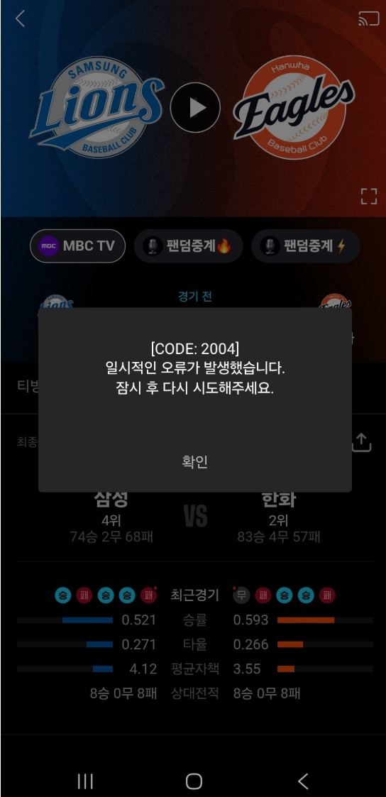오늘 오후 6시10분쯤부터 티빙앱을 통해 KBO PO 경기 중계 채널에 접속 시 동영상 재생이 지연되거나 재생이 되지 않는 오류가 발생했습니다.