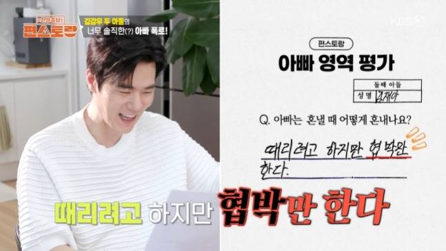 24일 방송된 KBS2 예능프로그램 ‘신상출시 편스토랑’(이하 ‘편스토랑’)에 중2 첫째 아들 김태은 군과 초6 둘째 아들 김재아 군이 김강우를 평가한 내용이 공개됐다.