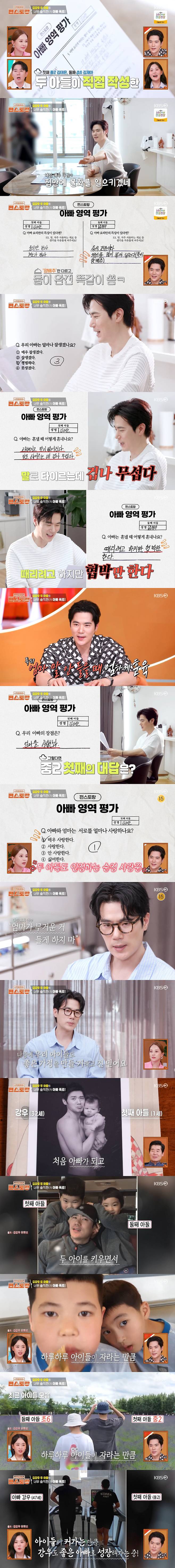이날 김강우는 아빠에 대한 아이들의 속마음이 담긴 글을 읽으며 웃음을 터트렸다. 첫째 중학교 2학년 김태은 군과 둘째인 초등학교 6학년 김재아 군이 아빠 몰래 아빠 영역 평가를 작성한 것. 김강우는 "아이들 속마음 안 궁금하다. 알고 싶지 않다. 좋은 말 없을 것 같다"면서 "집안에 불화를 일으키겠다"면서 아빠 영역 평가를 확인했다.