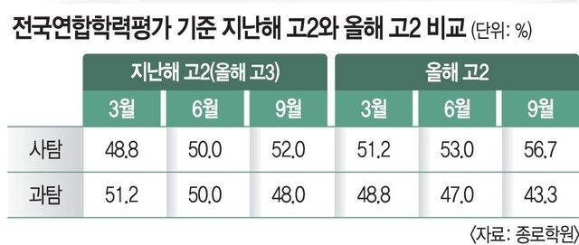 먼저 올해 고3이 고2였던 지난해와 올해 탐구영역에서 어떤 움직임을 보였는지 들여다볼 필요가 있다. 올해 고3은 지난해 3월 치른 학평에서 과탐을 51.2% 선택했다. 과탐 선택자가 더 많았다는 얘기다. 하지만 6월 학평 때는 50%로 떨어지고 9월 학평에서는 48%로 밀려났다.