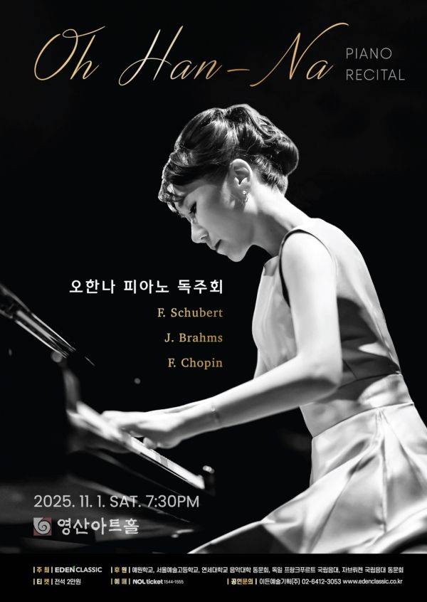 피아니스트 오한나의 독주회(포스터)가 다음 달 1일 서울 영등포구 영산아트홀에서 열린다. 오한나는 연세대 음대를 거쳐 독일 프랑크푸르트 국립음대 석사와 자브뤼켄 국립음대 박사를 졸업했다. 이탈리아 유테르페 국제 피아노 콩쿠르 1위를 차지한 뒤 한국과 이탈리아, 프랑스, 독일 등에서 독주 또는 협연을 했다. 귀국 이후 후학을 양성하는 한편 한국피아노두오협회 활동 등 전문 연주자로서 다양한 무대에 서고 있다. 2023년 (주)아트코리아방송과 아트코리아문화예술협회가 주최 및 주관하는 제3회 아트코리아방송 문화예술대상 음악 부문 피아니스트 대상을 받았다. 이번 독주회에서는 브람스의 ‘7개의 환상곡’ Op.116과 쇼팽의 피아노 소나타 3번 Op.58 등을 연주한다. 문의 이든예술기획(02-6412-3053)