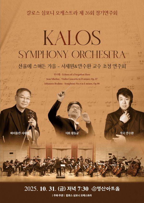 칼로스 심포니 오케스트라가 오는 31일 서울 영등포구 영산아트홀에서 정기연주회(포스터)를 연다. 칼로스 심포니 오케스트라는 1989년부터 지금까지 월 1회 연주 봉사를 하는 ‘열린 소리 합주단’을 기반으로 2008년 창단됐다. 서울시향 출신 바이올리니스트 겸 지휘자인 황동균을 중심으로 국내 유수의 오케스트라 출신 단원들로 구성됐다. 매년 다양한 프로그램의 콘서트를 통해 클래식 저변을 넓히는 오케스트라로 성장해 왔다. ‘선율에 스며든 가을 서세원&안수환 교수 초청 연주회’라는 부제를 단 제26회 정기연주회는 바이올리니스트 서세원(오스트리아 구스타브 말러 사립음대 교수), 작곡가 안수환(단국대 교수)과 함께한다. 문의 칼로스 심포니 오케스트라(010-8770-6077)