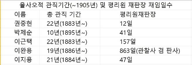 1899년 5월 30일부터 을사조약일인 1905년 11월 17일까지 평리원 재판장은 중복을 포함해 35명이었고 총 재임 기간은 2394일이다. 이 을사오적 4명이 평리원 재판장에 재임한 기간은 총 257일이었다. 총인원 35명의 11.4%인 4명이 총 재임 기간 2394일의 10.7%를 근무했다. 그것도 모두 겸직이었고 본업은 행정 관료였다.
