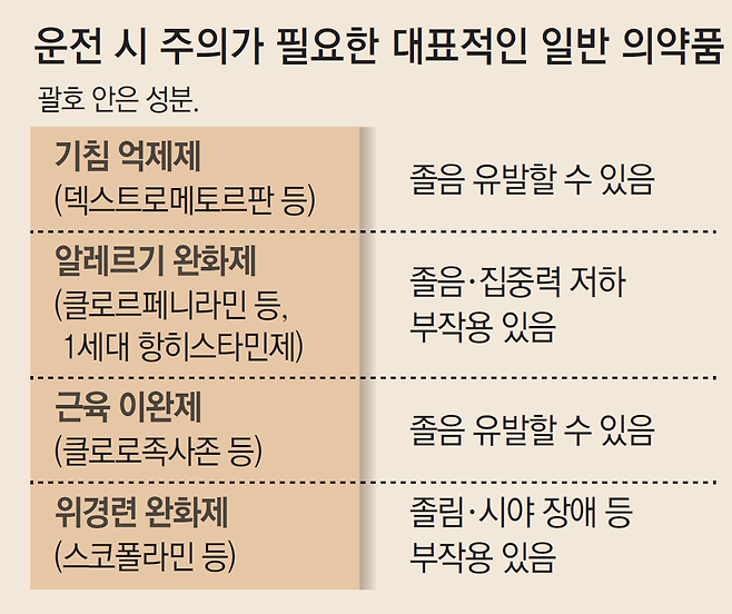 대표적으로 비염 치료에 사용되는 1세대 항히스타민제는 뇌의 각성 기능을 억제해 졸음과 집중력 저하를 유발한다. 종합감기약에 흔히 포함되는 덱스트로메토르판 역시 과다 복용 시 졸음·환각·어지럼증 등의 부작용이 보고된 바 있다. 근육이완제 성분인 클로르족사존, 위경련 완화제 스코폴라민 등 진경제 계열 약물도 졸음을 유발할 수 있다. 이들 약품은 음주처럼 현장 검사가 불가능하다. 사고 발생 후에야 국립과학수사연구원의 혈액 분석 등을 통해 복용 여부를 확인할 수 있다.