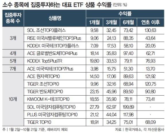 먼저 집중투자형 ETF 가운데 최고 수익률을 거둔 상품은 연초 이후 130.63% 수익률을 기록한 'SOL 조선TOP3플러스'다. 레버리지(일간수익률의 2배 반영) 상품을 제외한 전체 상품 가운데 수익률 7위에 해당한다. 2023년 10월 상장된 'SOL 조선TOP3플러스'는 한화오션(21.67%), 삼성중공업(19.51%), HD한국조선해양(18.58%)이 전체의 60%에 달하고 HD현대중공업(9.51%)을 비롯한 13개 종목이 40% 비중으로 담겼다.‘RISE 미국AI밸류체인TOP3Plus'와 'KODEX 미국테크TOP3플러스'도 성적이 양호하다. 이들 상품은 연초 이후보다 6개월 수익률이 각각 88.35%, 58.10%로 높은데, 이는 미국 증시가 4월 도널드 트럼프 행정부의 관세 부과 정책으로 강도 높은 조정을 겪은 영향으로 풀이된다. 지난해 7월 상장된 'RISE 미국AI밸류체인TOP3Plus'는 엔비디아(14.47%), 마이크로소프트(14.09%), 오라클(12.52%)이 전체의 40%를 웃도는 가운데 인텔, AMD, 마이크론, 델 등 12개 종목을 3.91~6.39%씩 담고 있다. 또 'KODEX 미국테크TOP3플러스'는 글로벌 AI(인공지능) 테크를 이끄는 빅3 마이크로소프트, 애플, 엔비디아를 최대 75%(개별 최대 투자 한도 25%)까지 담는 상품이다.