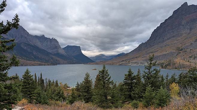 우뚝 솟은 산을 끼고 있는 드넓은 호수 한가운데 높이가 4m 정도 되는 아주 작은 섬 하나가 보였다. 글레이셔 공원에서 가장 사진을 많이 찍는다는 와일드 구스 섬(Wild Goose Island)이었다. 거위가 사는 섬이 아니라, 전설에 의해 섬 자체가 사랑을 나누는 두 마리의 거위라는 섬이다. 영화 <샤이닝>의 오프닝 장면에 나온다는데, 영화를 보았음에도 전혀 기억나지 않는다.