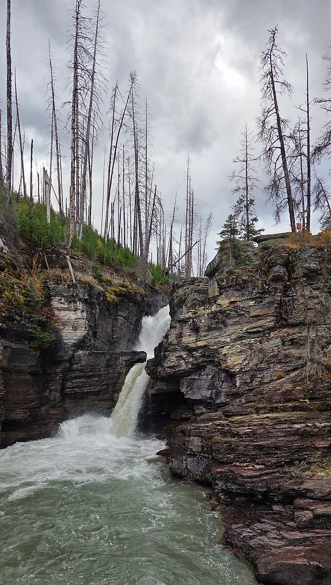 | ▲ 세인트 메리 폭포로 가는 오솔길 우리는 10년 전 화재가 남긴 고사목들과 가을바람에 노랗게 변한 잡풀 등이 야릇한 옥빛 호수 물과 어우러진 모습에 넋을 빼앗겼다. |