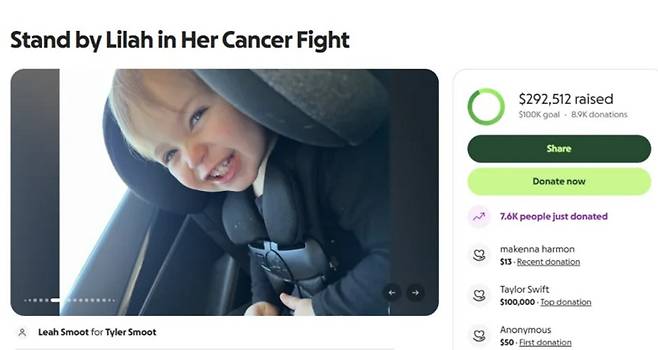 릴라의 엄마인 케이틀린 스무스는 지난 8일 자신의 개인 계정에 테일러가 기부금을 전달한 소식과 함께 릴라에게 보낸 편지 내용을 공개했다. 테일러는 릴라의 가족이 운영하는 펀딩 페이지에 직접 "나의 친구 릴라에게 가장 큰 포옹을 보냅니다! 사랑을 담아, 테일러"라고 적어 팬을 향한 사랑을 드러냈다.