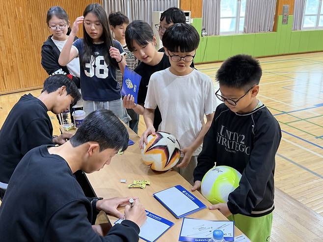 ‘축구로 하나된 시간’ 충남아산 김주성·이연우, 온양중앙초 방문해 ‘비타민 스쿨’ 진행