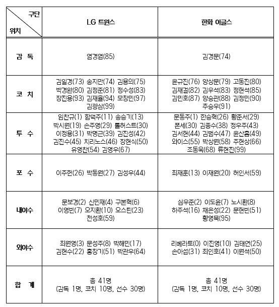 정규시즌 1위로 한국시리즈에 선착한 LG는 염경엽 감독과 10명의 코칭스태프가 팀을 지휘한다. 30명의 선수 엔트리는 투수 14명, 야수 16명으로 구성됐다.