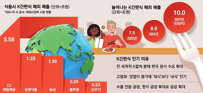 해외 매출은 국내 공장에서 생산해 수출하는 경우, 해외 공장을 통해 현지 유통망에서 판매하는 경우를 포괄한다. K간편식은 냉동 만두·치킨·김밥·라면·밀키트 등이 주류다.