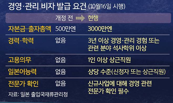 지난 16일부터 새 규정이 시행됨에 따라 이제는 기존보다 6배 많은 3000만엔(2억8300만원) 이상 자본금이 있어야 비자를 받을 수 있다. 여기에 상근 직원 1명 이상 고용 의무가 추가됐고 경력·학력 요건도 생겼다. 비자 발급 신청자나 상근 직원 중 1명은 중상급 수준의 일본어 능력도 갖춰야 한다.