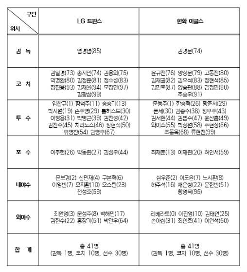 해당 명단에 따르면 플레이오프 엔트리에 포함됐던 엄상백과 야수 권광민이 제외되고 대신 투수 김종수와 윤산흠이 이름을 올렸다.