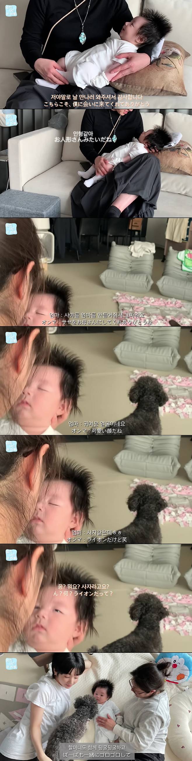 특히 외할머니는 하루의 기저귀를 직접 갈아주며 무한한 애정을 보였다. 그는 "하루야, 드디어 만났다. 와줘서 고맙다. 사야를 엄마로 만들어줘서 고맙다"며 "정말 귀여운 얼굴이다. 사자 같아"라고 말해 웃음을 자아냈다.