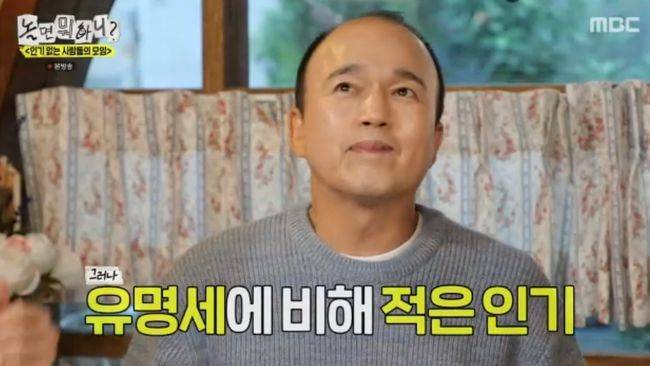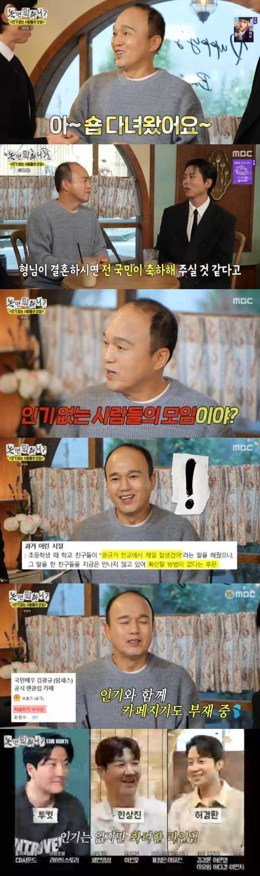 사실 이들은 유명하지만 팬덤이 크지 않는, 인기 없는 사람들의 모임 멤버들을 초대하는 중. 김광규는 "팬덤이 없는 건 아니다. 있다. 내 주위 친구들이 '유명한 거에 비해서 팬덤이 많지 않다'. '유명한 거에 비해서 재산이 너무 없다'더라. 김원해, 박성웅, 손종학, 장혁진, 오대환, 유재명, 윤경호랑 단톡방이 있다. 이분들도 팬덤이 크지 않지 않냐"고 말해 눈길을 끌었다.