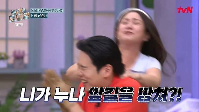 이어 박나래는 백호의 땀을 닦아주었다. 한해는 "둘이 땀 많은 것도 비슷하다"라고 했지만, 문세윤은 "되게 재미있는 콩트 같다"라고 말해 웃음을 안겼다. 이후 팀 선정을 하는 시간. 백호는 박나래를 바라보다가 박나래가 든 꽃다발을 한해에게 건넸다. 그러자 박나래는 한해를 습격, "너 때문에. 네가 누나 앞길을 망쳐?"라고 분노했다. 백호는 "제가 못하면 누나한테 혼날 것 같았다. 피지컬적으로 밀릴 수도 있을 것 같고"라며 살아남으려고 한해를 선택했다고 털어놓았다.