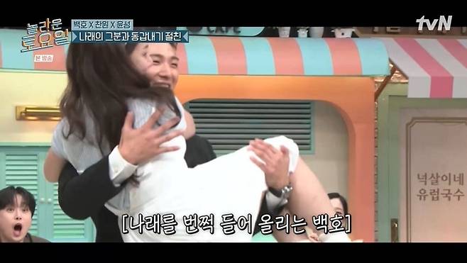 발목을 다쳐서 못 걷는 척 연기를 한 박나래. 이에 백호는 박나래를 안았고, 박나래는 "고마워요. '놀토'"라고 외치며 "나 오늘 출연료 안 받는다"라고 흡족해했다.