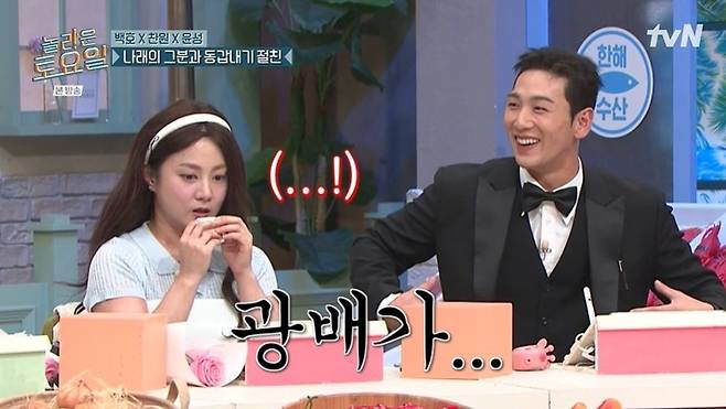 백호는 사전 인터뷰에서 박나래에게 관심 있는 부분이 있다고 했다고. 박나래는 한껏 기대했지만, 백호는 "오랫동안 활동하시는 걸 지켜봤다. 오늘 의상과도 연관이 있는데, 누나가 광배가 남다르더라"라고 궁금해했다. 백호는 "이게 진짜 V테이퍼라고 해서 쉽게 나오지 않는 깊이감과 두께감이다. 어떻게 키웠는지 관심이 계속 가더라"라고 했고, 박나래는 "저한테 물어볼 게 광배밖에 없냐"라고 실망했다. 백호는 "사실, 네"라고 인정했다.