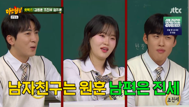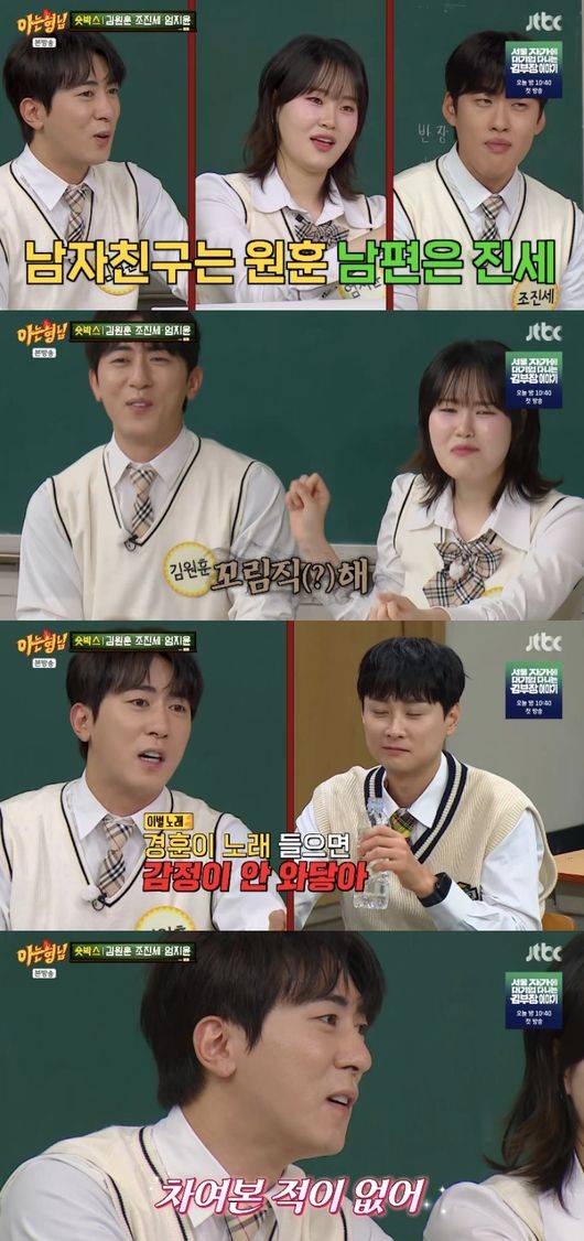 그러자 민경훈은 “지윤이도 스타일 있을 거 아니냐. 둘 중에 누가 더 취향이냐”라고 질문했다. 엄지윤은 “왜 둘 중에 골라야 하냐”라면서도 “만약 둘 다 미혼이면, 남자친구랑 남편이 다르다. 남자친구는 김원훈이고 남편은 조진세”라고 밝혔다.