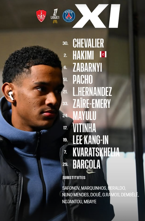 PSG는 슈발리에, 하키미, 자바르니, 파초, 에르난데스, 자이르-에메리, 마율루, 비티냐, 이강인, 크바라츠헬리아, 바르콜라가 선발로 나선다.